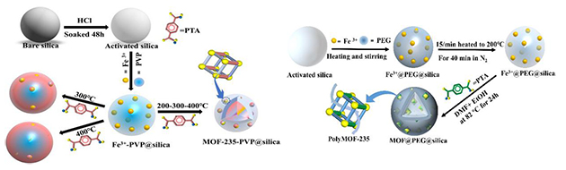 随后,研究人员选择了高耐热性的金属有机骨架(MOF-235)和聚乙烯吡络烷酮(PVP)、聚乙二醇(PEG)亲水性聚合物,通过溶剂热法和高温程序煅烧法将其共同修饰在硅胶表面,合成了具有亲/疏水性的核壳复合色谱填料。