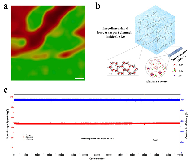 Zn(ClO4)2盐冰的低温拉曼面扫(a)、离子传输机制示意图(b)及锌离子混合电容器的循环稳定性(c)。