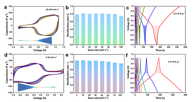(c) 正向导通超级电容器二极管的横流充放电曲线 (d) 负向导通超级电容器二极管的循环伏安曲线