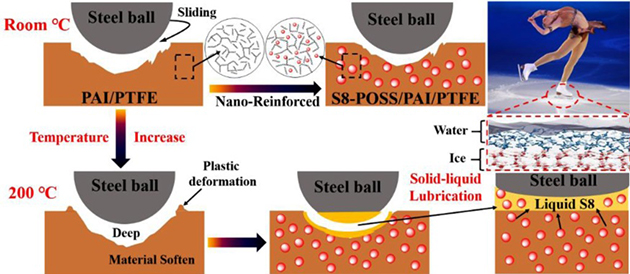 受滑冰运动过程中冰刀与冰层接触界面冰水复合状态的启发,研究人员采用具有可逆动态双硫键的可液化斜方硫(S8)对八乙烯基多面体低聚倍半硅氧烷(POSS)改性处理,获得了具有特殊结构的热可相变纳米复合物(S8-POSS);将其复合到润滑涂层中,一方面发挥其自锚固作用改善了涂层的机械承载能力,另一方面利用其在摩擦过程中的热致相变实现了固液复合润滑效应和自修复作用(图1),有效降低了涂层的摩擦系数和磨损率。