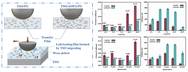 此外,研究人员还通过氧化石墨烯(GO)表面的重氮化反应、改性GO的锚固作用、聚氨酯的原位聚合实现了基质强化(图2),材料的交联密度及致密性有效提升,使复合涂层的摩擦系数降低90%,磨损率降低一个数量级,且摩擦寿命延长5倍左右。将强化基体与液相硅油复合,使得三元复合涂层的摩擦系数进一步降低30%,寿命延长1.35倍。与未强化基体的复合涂层相比,摩擦系数降低60%,磨损寿命最高提升5倍,且这种提升效果在高载和高速下更为明显(如图3)。此外,由于硅油的疏水性及其在涂层基体中的毛细管阻力,复合涂层的耐腐蚀性也得到了有效提升。