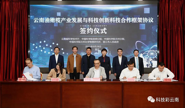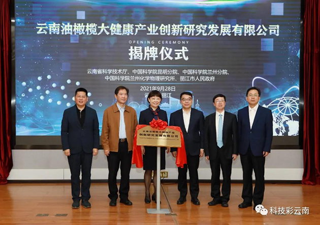 2021年9月28日,云南省科技厅、中科院昆明分院、中科院兰州分院、中科院兰州化学物理所、丽江市政府举行院地科技合作签约仪式,揭牌成立云南油橄榄大健康产业创新研究发展有限公司。院地五方将围绕打造油橄榄大健康全产业链,深化科技创新合作,努力将丽江打造成油橄榄大健康产业的技术和人才集聚高地。丽江市委书记浦虹,云南省科技厅党组书记、厅长王学勤出席活动并讲话。
