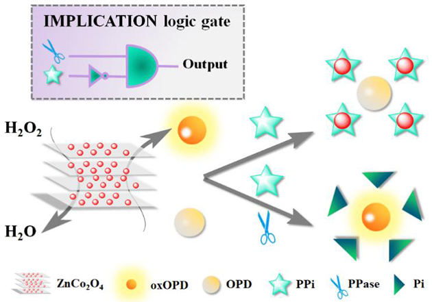 研究人员在该DESs中引入双金属盐Cd(NO3)2和Co(NO3)2,成功制备出CdCo2O4纳米片。该材料具有类氧化物酶、类过氧化物酶和类过氧化氢酶性质,可实现血液中葡萄糖的高灵敏检测(Microchimica Acta, 2020, 187, 314)。在此基础上,又制备出具有类过氧化物酶活性的ZnCo2O4纳米片,用于焦磷酸(PPi)和焦磷酸酶(PPase)的比色检测,并合理构建出IMPLICATION逻辑门(图2)(Talanta, 2021, 222, 121680。该论文入选Web of Science 2021年高被引论文)。