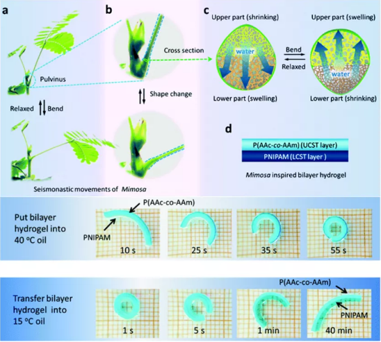 有些人工合成的高分子材料也具有刺激响应性,比如在选择性溶剂中溶胀,或随温度变化发生溶胀度的改变,通过合适的结构构筑,可以简单仿生植物的应激性(如图2)。