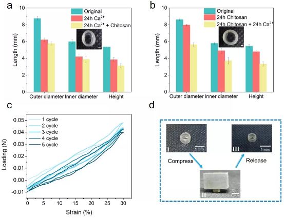 (a, b)海藻酸钠管状结构分别在Ca2+溶液和壳聚糖溶液中形变程度。(c, d)持续收缩后,管状海藻酸钠水凝胶的力学性能。