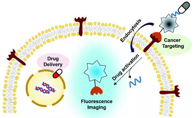 诊疗前药作为前药的一种,兼具了诊断与治疗双功能,能实现药物在肿瘤部位的可控释放,并对活性药物的释放进行监测,及时反馈治疗效果(图1)。通过这种前药分子,可以让人们对药物分子在体内活动进行可视化的监测和判断,同时为医生根据药物在体内的治疗情况和病情的发展制定合理的用药方案提供重要的依据。
