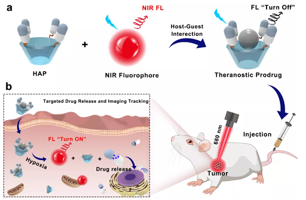 图2. 靶向肿瘤缺氧微环境的诊疗前药NMAC4A-CyNH2制备(a)与释放(b)示意图
