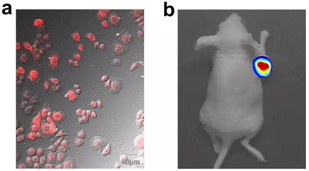 图3 NMAC4A-CyNH2在肿瘤细胞(a)与荷瘤小鼠(b)中的成像图