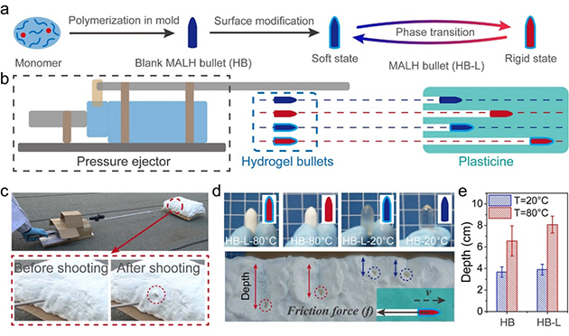理论模拟结果也表明,这种显著的润滑转变行为主要归因于模量动态转变的自适应接触演化机制(图2b)。这种基于接触形态的润滑调控行为具有响应快、可逆性好以及宽范围载荷耐受性特点(图2c-d)。基于此,研究人员开发了智能润滑型水凝胶子弹和功能贴片,有望用于工程冲击穿刺和移动装备制动等领域(图3-图4)。