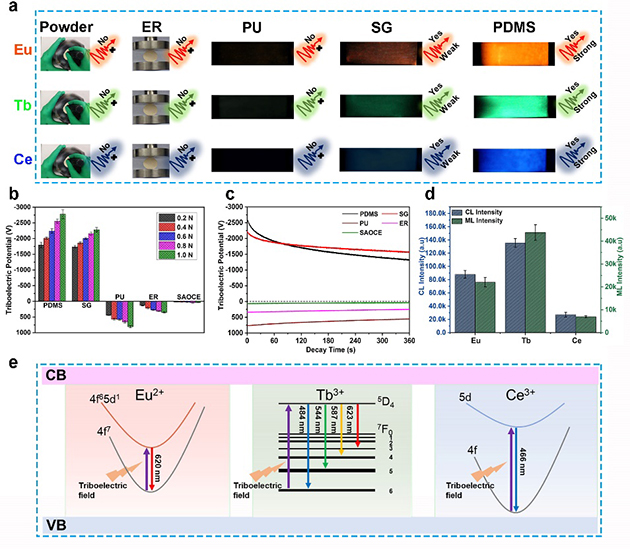 SAOCL/PDMS的机械发光展现出了陷阱非依赖性和自恢复特性,说明材料在机械发光的过程中具有自激活行为,即在力学作用下材料内部电子可直接跃迁到激发态。为进一步明确SAOCL/PDMS的力学激发过程,该团队从机械发光的基体效应出发,结合SAOCL的热释光谱和摩擦起电性能分析,提出了SAOCL/PDMS非压电机械发光的界面摩擦电场诱导电子轰击模型,即在SAOCL与PDMS的界面摩擦作用下,转移到PDMS上的电子在界面摩擦电场作用下加速轰击SAOCL,引起SAOCL内部电子跃迁到激发态,进而产生机械发光。研究人员进一步分析了材料的机械发光与阴极射线发光性能,二者之间的一致性也为提出的界面摩擦电场诱导电子轰击发光模型提供了直接证据(如图2)。