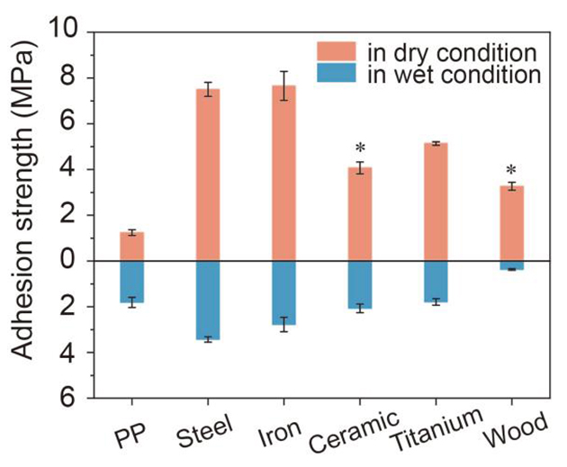 黏附材料在工程材料领域有非常重要的应用,然而在高强度、高湿度(水下)的应用环境中(渔船、游船、划艇、潜艇等),水分子极易破坏胶黏剂的黏合界面,导致功能失效。市面上现有的大多数胶黏剂水下黏附强度低、耐水性弱,无法满足长期的水下应用需求。因此,开发具有较强界面黏合力、耐水性和机械耐受性的黏附剂是工程应用和技术领域的挑战之一。