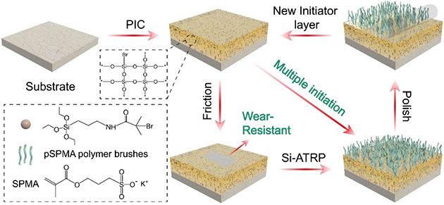 表面引发原子转移自由基聚合(SI-ATRP)是一类高度可控的表面改性方法,接枝的聚合物刷为表面科学和工程的研究提供了理想模型。然而,在湿环境下聚合物刷及引发剂层的机械耐磨性以及化学稳定性较差,限制了其在实际生产中应用,构建坚固的引发剂层,接枝牢固的聚合物刷层是目前该领域的挑战。