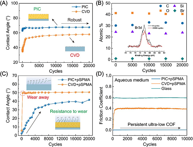 该方法的关键是构建了一种具有高机械稳定性、持续引发活性的引发剂涂层(Persistent Initiation Coating,PIC),如图1所示,将引发剂引入到无机溶胶-凝胶纳米涂层中,而后表面引发接枝修饰聚合物刷。与传统的化学气相沉积(CVD)方法制备的硅烷引发剂表面相比,PIC能有效提高引发剂层的力学稳定性,使其能够承受上万次的摩擦循环(图2),最重要的是,在PIC上接枝的聚合物刷也比传统CVD方法制备的聚合物刷具有更高的耐磨性。