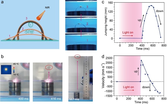 光刺激下驱动器可以在极短的响应时间(400 ms)内从液体介质跳越到空气中,最高速度为2 m/s,高度可达14.3 cm。