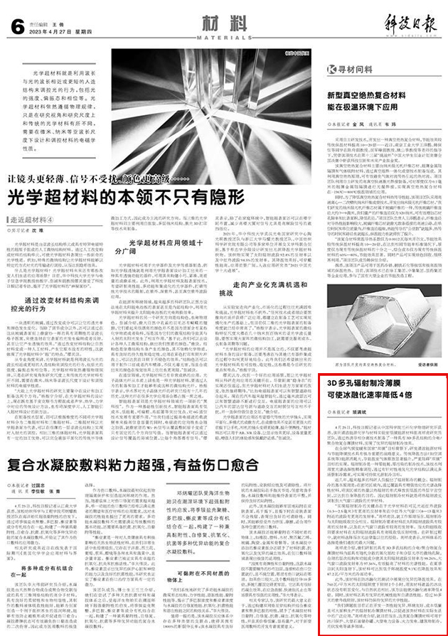 “我们课题组目前正在开发一类性能优异、环境友好、成本低廉且可大面积生产的辐射制冷薄膜材料,以促进该类材料在实际生活中的广泛应用。”高祥虎介绍,就目前而言,这类复合薄膜材料可用于冰川保护、大型石油储存罐、大型电力设备、火力发电、建筑物制冷、光伏发电等诸多领域。