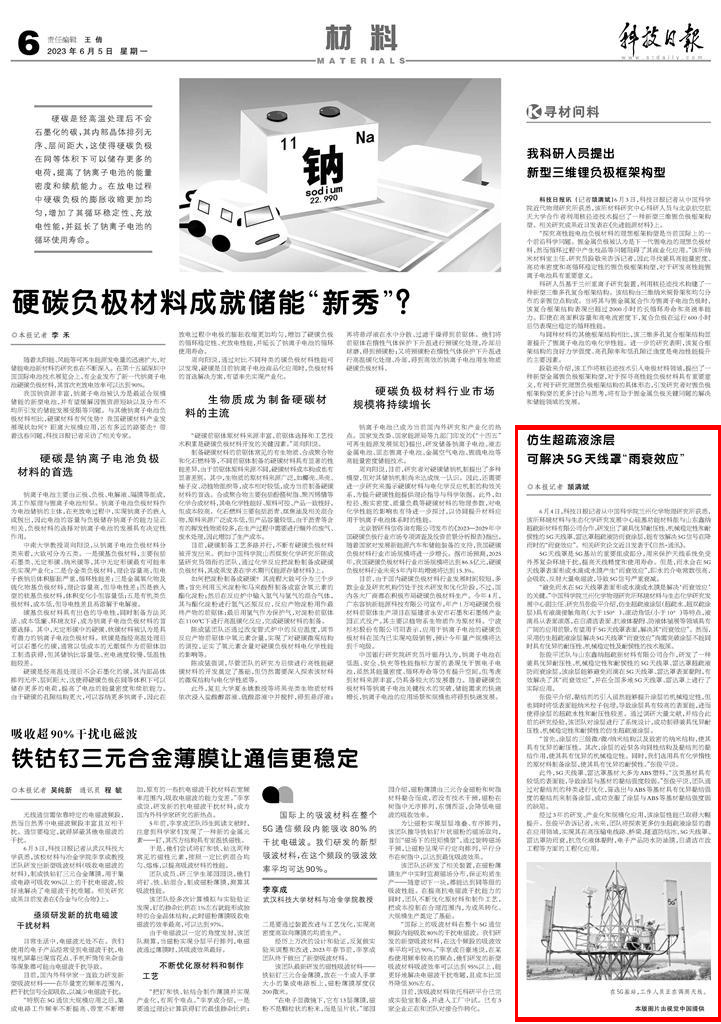 张俊平团队与山东鑫纳超疏新材料有限公司合作,研发了一种兼具优异耐压性、机械稳定性和耐候性的5G天线罩、雷达罩超疏液防雨衰涂层,该涂层能够避免雨滴在5G天线罩、雷达罩表面黏附,有效解决了其“雨衰效应”,并在全国多地5G天线罩、雷达罩上进行了实际应用。