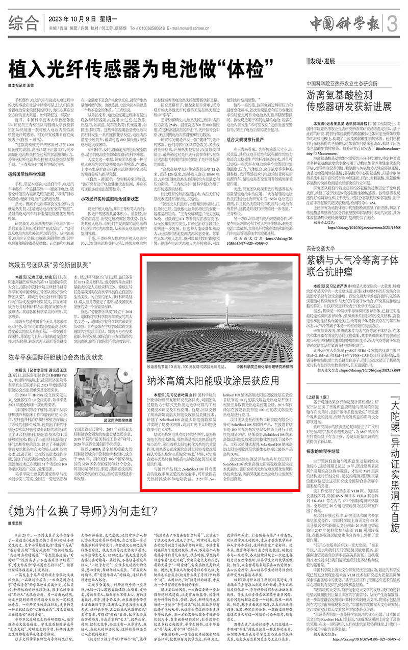 本报讯(见习记者叶满山)中国科学院兰州化学物理研究所研究员高祥虎、刘刚团队长期致力于塔式光热发电光学材料与工程关键技术研发及工程应用。近期,团队突破了纳米高熵高温太阳能吸收涂层关键技术,研制了SolarShot1108高温太阳能吸收涂层并实现了规模化制备,高温工况下太阳能吸收率可达0.975。