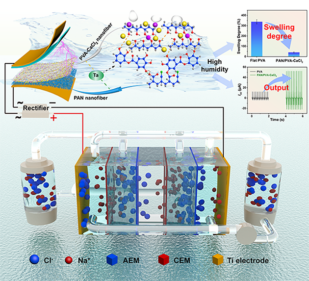 图3. 耐溶胀抗磨PAN/PVA-CaCl2复合膜基耐湿TENG用于海水淡化