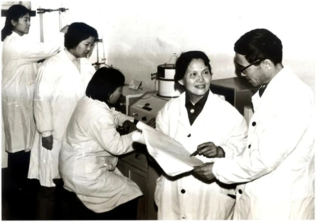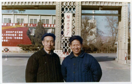1983年,顺丁橡胶工业化生产成功后,周望岳(右)和张国栋在锦州六厂大门前合影。周望岳供图