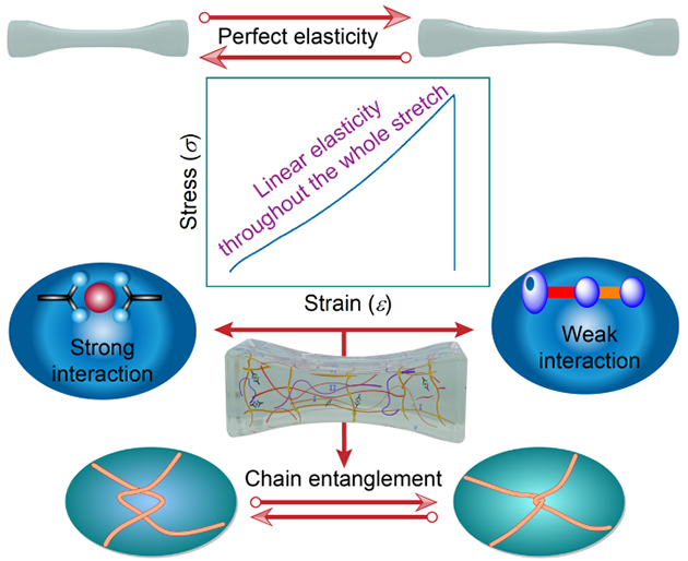近二十年,聚合物凝胶,尤其是水凝胶,其力学强度、韧性、疲劳和黏附等性质的调控和提升已取得巨大进步,体现在先进的力学机制和构造方法。然而,在力学强度和完美弹性之间寻求权衡仍是一个挑战。
