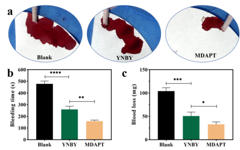 基于各种黏土矿物属性的差异,团队选择混维凹凸棒石黏土、蒙脱石、高岭石、埃洛石和沸石开展了止血性能的对比研究。选择全血动态血红蛋白吸光度、凝血指数、血浆动力学、红细胞和血小板黏附和激活以及小鼠断尾止血模型等指标系统研究材料的止血性能和止血机理。研究发现,混维凹凸棒石黏土确实具有最佳止血性能。