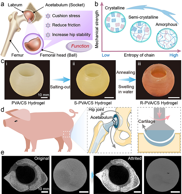 关节软骨润滑功能下降,就像机器零件缺乏润滑油一样,会引发软骨退化、磨损,进而诱发骨关节炎等疾病,严重影响患者的生活质量。开发能模拟天然关节润滑的材料和技术,一直是医学界和材料科学领域的重要课题。近日,中国科学院兰州化学物理研究所润滑材料全国重点实验室获得了具有低熵聚合物链态和高结晶度的PVA/CS(聚乙烯醇/壳聚糖)水凝胶。经过水化处理后,这种水凝胶材料具备了高机械强度和优异润滑性。相关论文发表于《先进功能材料》。