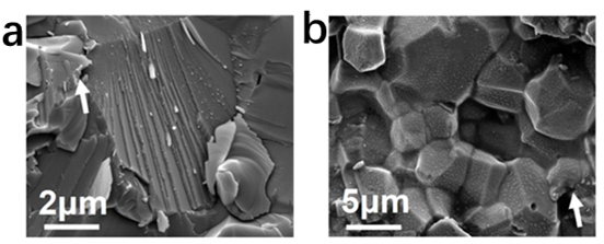 低温 400℃ 下穿晶断裂(a)和高温 800℃ 下沿晶断裂(b)特征 图片来源:兰州化物理所