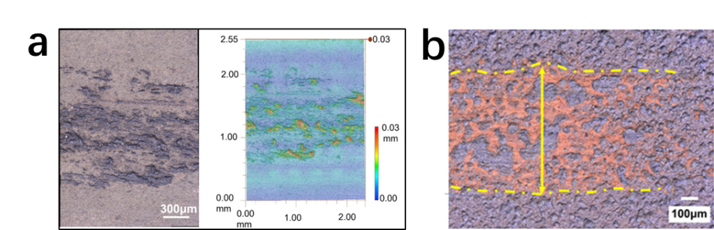 1000℃ 下摩擦 30 min(a)和 1000℃ 下摩擦 180 min(b)后材料磨损表面形态 图片来源:兰州化物所