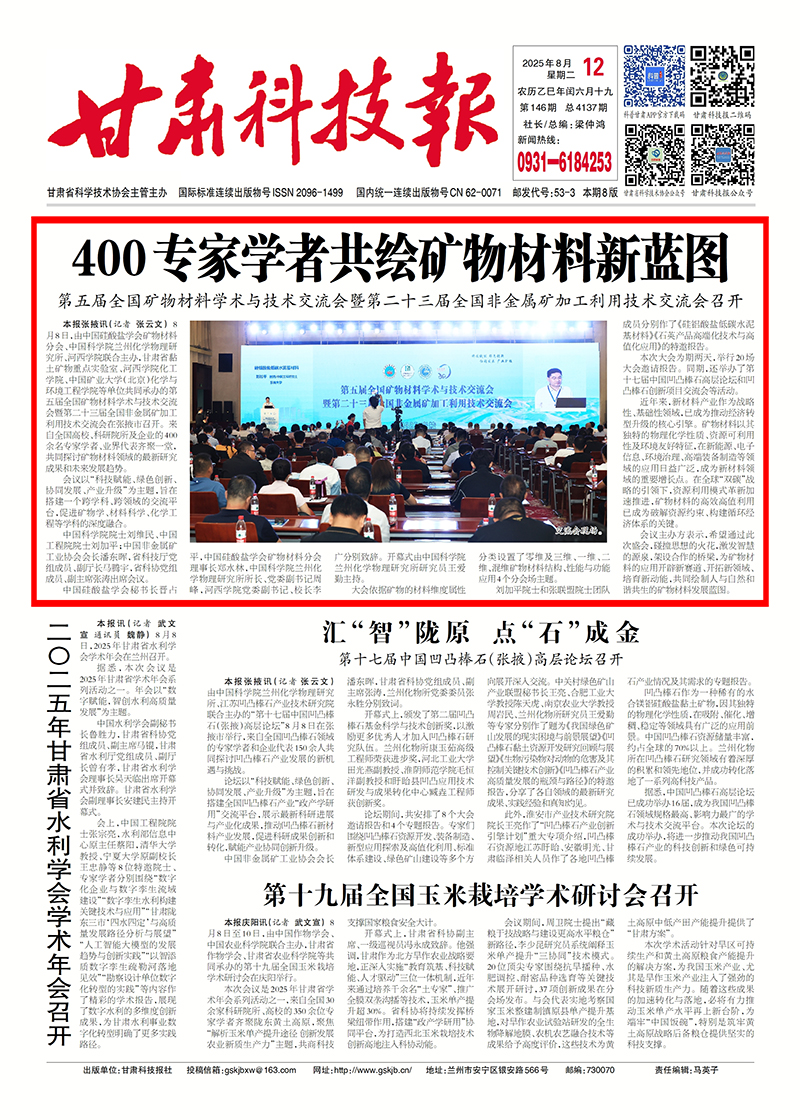 甘肃科技报社融媒体中心张掖讯(记者 张云文)8月8日,第五届全国矿物材料学术与技术交流会暨第二十三届全国非金属矿加工利用技术交流会在张掖市开幕。来自全国高校、科研院所及企业的400余名专家学者、业界代表齐聚一堂,共同探讨矿物材料领域的最新研究成果和未来发展趋势。