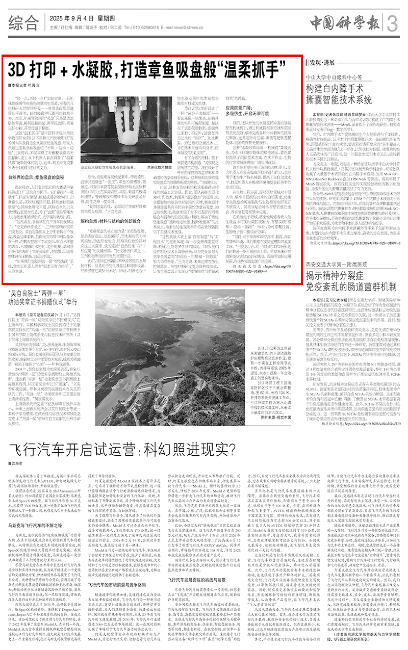 “这些挑战本质上是‘自然智慧’与‘工程技术’的差距体现,每一步突破都需要材料、机械、生物等多学科的协同。目前,我们虽在部分技术上取得进展,但与完全复刻天然章鱼吸盘的‘自适应-自感知-自修复’能力仍有差距。”王晓龙说,未来还需在仿生控制算法、智能材料研发等方面持续探索,让仿生吸盘真正实现从“模仿自然”到“超越自然”的跨越。