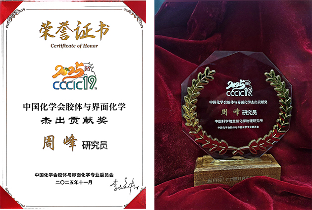 甘肃科技报社融媒体中心讯(记者 张云文) 近日,在江西赣州闭幕的全国胶体与界面化学学术会议上,中国科学院兰州化物所周峰研究员荣获2025年度“中国化学会胶体与界面化学杰出贡献奖”。该奖项旨在表彰我国在胶体与界面化学领域做出卓越贡献的学者,每两年评选一次。此次获奖是兰州化物所科研人员首次获得该项殊荣。