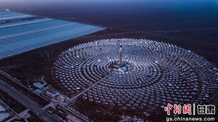 2024年2月26日,在茫茫雪地里持续吸光发热的首航敦煌100兆瓦熔盐塔式光热发电站。(资料图)王斌银 摄