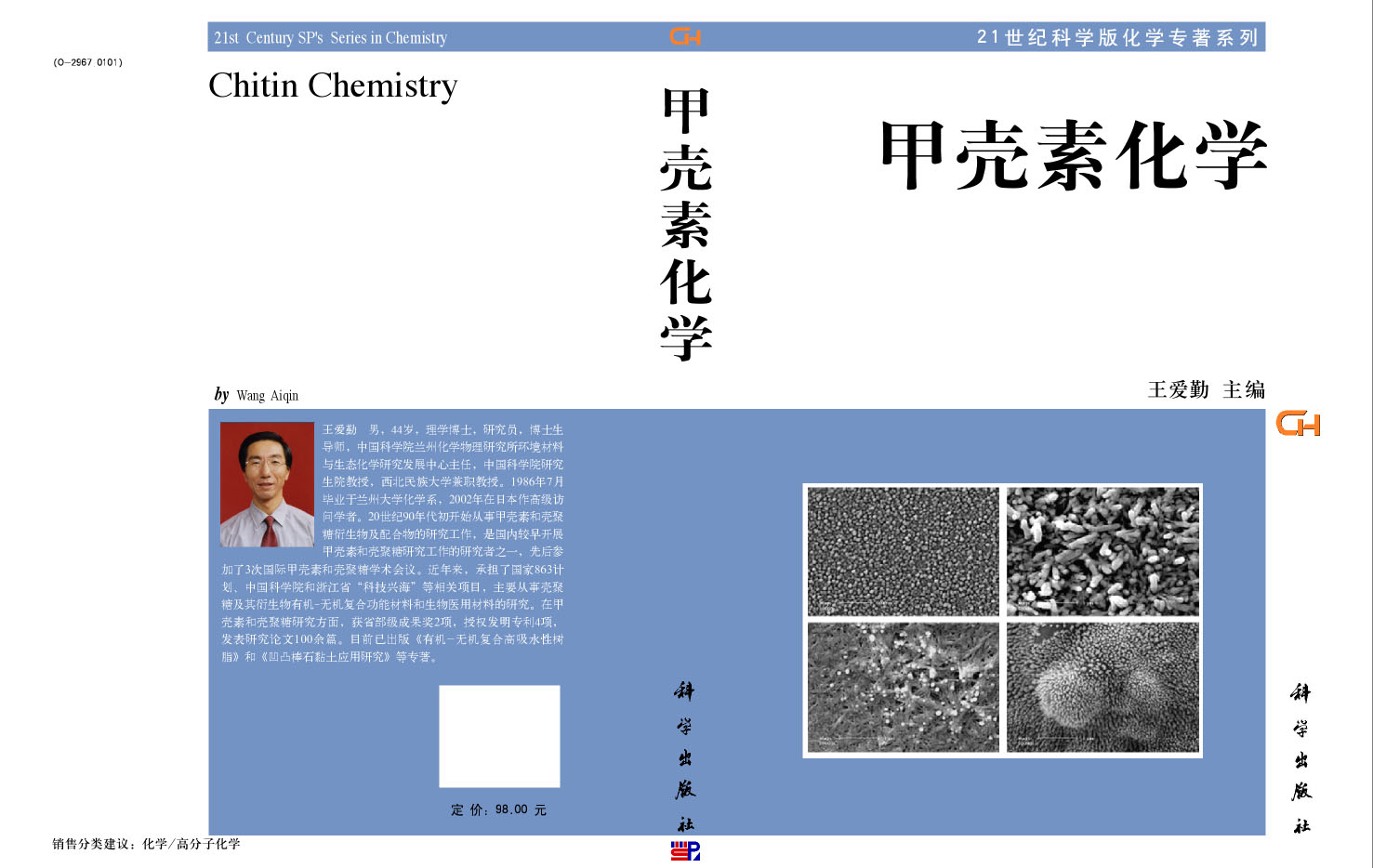 近日,由科学出版基金资助,中国科学院兰州化学物理研究所王爱勤研究员等编著的《甲壳素化学》一书由科学出版社正式出版发行。中国工程院管华诗院士为该书作序。