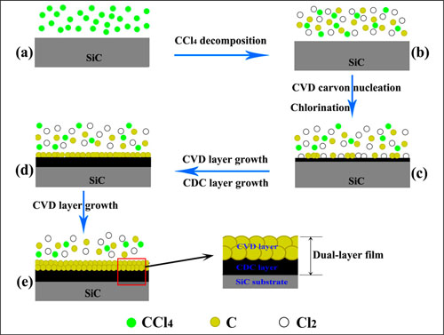 研究人员以四氯化碳为氯气源和碳源,通过碳化物衍生碳(CDC)过程和化学气相沉积(CVD)法,成功地在碳化硅表面制备出了双层碳膜。该双层碳膜分别由通过对碳化硅氯化形成的CDC亚表层和对四氯化碳热解形成的CVD表层构成。温度对该双层碳膜形成有重要作用。由于CDC过程的氯化率远高于CVD过程的沉积速率,因此CDC层比CVD层更厚,研究人员认为可以通过引入氢气以及低温蒸发四氯化碳的方法降低CDC层的厚度。该双层碳膜的形成机制为碳化硅的氯化和CVD层的形成,这两个过程同时发生而又相互竞争。
