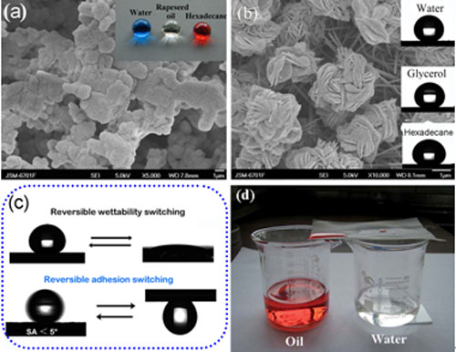 (a) 超疏油铝片的表面形貌;(b) 超疏油铜片的表面形貌;(c) 油滴在表面超疏油/超亲油及滚动/粘附的智能转变示意图;(d) 超亲水-超疏油涂层用于油水分离的照片。