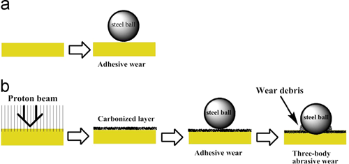 通过对经辐照的聚酰亚胺进行摩擦试验发现,摩擦系数的变化与材料表面息息相关。在摩擦实验过程中,辐照形成的碳化层在摩擦试验中被磨穿,所以摩擦过程可分为起始阶段和稳定阶段。质子辐照提高了起始阶段的摩擦系数,降低了稳定阶段的摩擦系数。起始阶段是辐照形成的碳化层与钢球的摩擦,摩擦系数较高,磨损机制为粘着磨损。稳定状态下,被磨损掉的碳层变成磨损碎片,吸附到表面,由于其较高的硬度和较小的尺寸,形成了三体磨粒磨损。三体磨粒磨损和低表面能降低了稳定阶段的磨损率和摩擦系数。研究成果发表在Wear(Wear316(2014)30–36)。