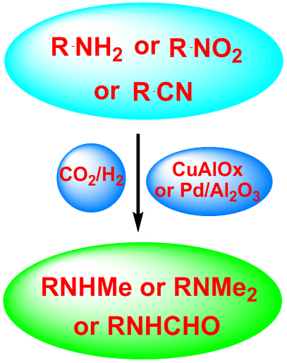 以碳资源的可持续循环利用为目标,他们以铜铝复合氧化物、负载纳米钯等为催化剂成功实现了胺与二氧化碳和氢气反应合成N-甲基、N,N-二甲基胺和N-甲酰胺。该类催化体系同时可以拓展到以硝基苯、腈类化合物为胺源,实现一步催化还原合成甲基化和甲酰化胺。相关研究工作发表在Chem. Sci.(2014, 5, 649-656)和Chem. Commun.(2014, 50, 189-191; 13521-13523),同时提交申请中国发明专利和美国专利(申请号:201310288088.7;US14/040,513)。