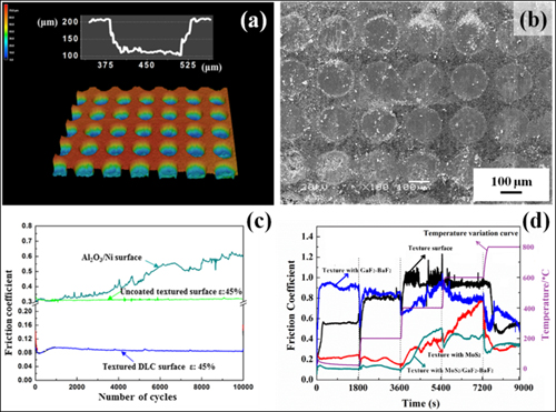 另外,将织构图案作为固体润滑剂(膜)的贮存槽,利用表面制备技术在陶瓷表面形成三维复合润滑结构,可使其表面的摩擦学性能得到进一步改善。沉积类金刚石碳基薄膜的复合润滑层在水环境下的摩擦系数可降低至0.06,相比光滑面的0.51降低了近一个数量级。同时,利用摩擦化学原理设计的复合润滑层,可实现材料在室温至800°C温度范围内连续加热过程中的宽温域润滑(Wear, 2015, 334-335, 23-34; Wear, 2016, 360-361, 97-103; Tribol. Int., 2014, 78, 134-141; Tribol. Int., 2015, 84, 142-151; Tribol. Int., 2016, 96, 258-268)。
