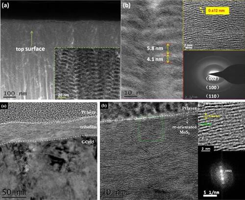 图1. 自形成纳米多层Mo-S-C-N薄膜及在真空环境下转移膜截面HRTEM图像