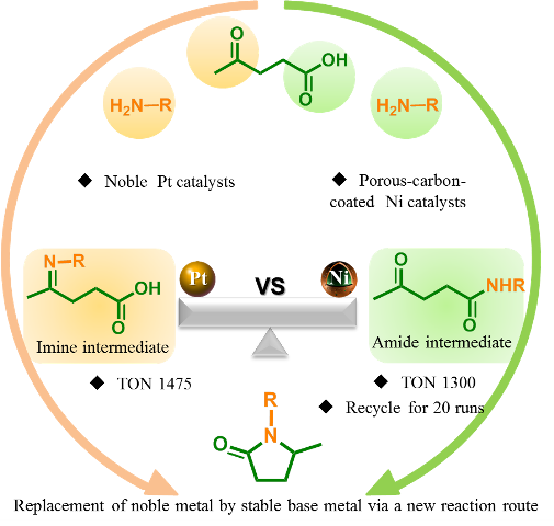 乙酰丙酸有两个官能团(羰基和羧基)能与胺类化合物反应,分别生成相应的亚胺和酰胺。基于贵金属铂和非贵金属镍催化剂在亚胺加氢反应中的活性差别(经过实验和理论计算验证),李福伟研究员团队发展了一条镍催化乙酰丙酸液相还原胺化制备吡咯烷酮的新路径。经过中间体分离表征和原位实验研究,发现在该反应中首先形成酰胺中间体,随后发生环化、分子内脱水、加氢得到吡咯烷酮(图右),这完全不同于以往报道的贵金属催化反应体系中经由亚胺中间体的反应路径(图左)。此外,他们与山西煤化所覃勇研究员课题组合作,利用原子层沉积技术所制备的多孔碳包覆的Ni NPs催化剂上厚度适中的多孔碳壳可有效防止Ni NPs的流失和团聚,并且不影响反应活性,催化剂在循环利用20次过程中未发现金属纳米粒子的流失和团聚。该研究为通过调控反应路径发展非贵金属催化剂以及提高多相催化剂在液相反应中的稳定性提供了新的研究思路。该研究结果近期发表于 ACS Catalysis,2017,7, 4927-4935。