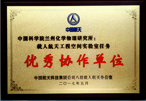 在我国“神舟十一号飞船”与“天宫二号”、“天宫二号”与 “天舟一号”货运飞船均实现成功对接后,中国航天科技集团公司八院载人航天办公室再次肯定了兰州化物所为我国“载人航天工程实验室任务”做出的突出贡献,并于近日年再次授予兰州化物所“优秀协作单位”称号。