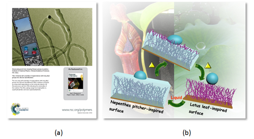 在上述研究工作基础上,首次在硅烷聚合反应过程中引入凹凸棒石(ChemPlusChem 2013, 78, 1503-1509; Chem Commun 2016, 52, 2744-2747)和碳纳米管(Carbon 2015, 93, 648-658)等纤维状纳米材料,合成了一系列新型硅烷聚合物纳米复合材料,成功地在多种基底材料上制备了稳定超疏水、超双疏涂层,涂层表现出优异的机械、化学和环境稳定性和一定的自修复性。研究表明,凹凸棒石在构筑超疏水、超双疏涂层方面优于膨润土、海泡石和高岭石等其他黏土矿物。在此基础上,拓展了其在药物控释(Adv Mater Interfaces 2014, 1300136)和液体弹珠(J Mater Chem A 2016, 4, 5859-5868,封面,图3a)等领域的应用,实现了空气层调控的药物控释和不同表面能液体弹珠的可控制备。此外,通过控制硅烷在凹凸棒石表面的水解缩合反应,制备了水性超疏水涂层,表现出了优异的综合性能(Adv Mater Interfaces 2017, 1700723,背封面,图3b)。