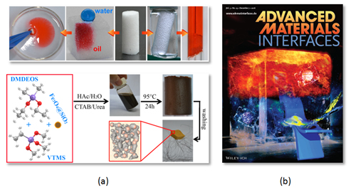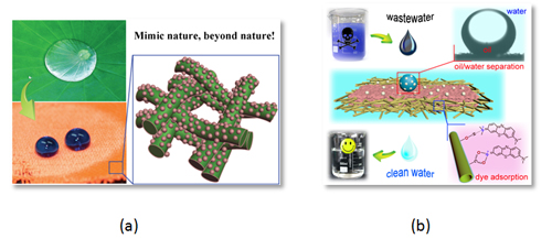 图2 (a) 硅烷聚合物稳定超疏水织物和 (b) 特殊润湿性薄膜用于水体净化