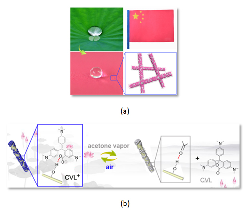 图4 (a) 基于类玛雅蓝颜料的彩色超疏水涂层和 (b) 溶剂致变色自清洁类玛雅蓝颜料
