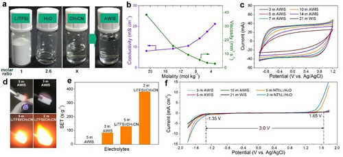 近日,中国科学院兰州化学物理研究所清洁能源化学与材料实验室阎兴斌研究员团队开发了一种制备混合电解液的方法。通过向典型的“water in salt”(WIS; 21 m LiTFSI/H2O)电解液加入共溶剂乙腈,制备了“acetonitrile/water in salt”(AWIS)混合电解液。与WIS电解液相比,AWIS混合电解液粘度低、电导率高、应用温度范围宽。同时,AWIS混合电解液保持了宽电压窗口、不可燃和易操作的特点。使用该AWIS混合电解液,研究人员组装了安全、宽窗口、高倍率的超级电容器。
