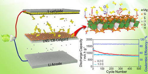 研究表明,该黏土矿物超亲电解液隔膜对聚硫化物穿梭具有明显的抑制作用,同时具有较高的Li+电导率、快速的Li+转移、超亲电解液性和较高的热稳定性。将其应用于锂硫电池时,在循环稳定性、倍率性能和抑制自放电等方面均表现优异。聚硫化物穿梭抑制机理研究表明,聚硫化物与黏土矿物的O活性位点之间通过形成Li-S键和Li···O键,从而使聚硫化物的穿梭得到有效抑制。相对于文献报道,黏土矿物超亲电解液锂电池隔膜在锂硫电池中具有明显优越性。此外,该隔膜具有较好的普适性,可通过简单的涂覆法制备,在LiFePO4和锂硫电池中均表现出了优异的性能。