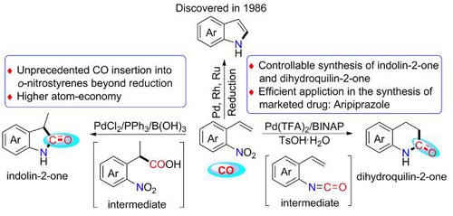 吲哚骨架化合物数量大、类型多,在生物、医药、农药、染料、香料等领域具有重要的应用价值。邻硝基苯乙烯还原环化是合成吲哚骨架化合物常用的方法之一,Cadogan-Soderberg反应就是以邻硝基苯乙烯衍生物为底物来合成吲哚,但需使用化学计量的有机膦作为脱氧剂,造成环境污染。1986年Cenini小组首次实现了金属催化一氧化碳(CO)还原邻硝基苯乙烯合成吲哚,在该催化体系中,一氧化碳担任Cadogan-Soderberg吲哚合成中有机膦的角色,大大提高了反应的原子经济性,解决了大量使用有机膦所带来的环境问题,但CO仅起还原剂的作用。三十余年来,Cenini、Driver、Soderberg等课题组为该反应发展了一系列高效催化剂,目前金属催化一氧化碳还原邻硝基苯乙烯法已成为合成吲哚的一个主要方法,但是实现CO同时作为羰基源插入一直是该领域的空白。