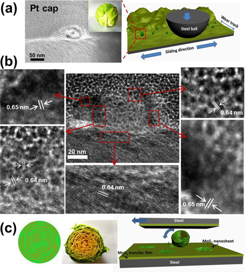 研究人员对具有独特纳米片纵向排列特点的二硫化钼纳米结构涂层进行了摩擦学性能研究。结果发现,在大气气氛中的固体干摩擦和固-液复合润滑以及真空干摩擦条件下,以上涂层在摩擦系数、磨损形貌和润滑寿命方面呈现出完全不同的摩擦学表现。在大气气氛中,固-液复合润滑状态下的二硫化钼因自取向排列形成高度有序的转移膜而较干摩擦状态具有更加优异的润滑性能。转移膜剖面分析表明二硫化钼分子层呈现出由基底粘附束缚到外表面自由滑移取向的转变(图1),有力证明了二硫化钼的晶内滑移机理。在真空环境下,首次观察到摩擦过程中二硫化钼纳米片受往复剪切应力的诱导可以相互包覆和卷绕,形成类似卷心菜结构的纳米球(图2),揭示了滚动运动的存在。通过脉冲激光沉积二硫化钼涂层的实验对比及分子动力学模拟,进一步证实了滚动运动对实现0.01以下超低摩擦的关键作用。