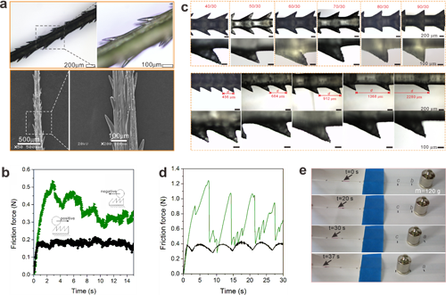 1. (a) 天然麦芒显微镜和SEM照片;(b)天然麦芒正反向滑动摩擦力曲线;(c)通过3D打印技术制备得到的人造麦芒结构体显微镜照片;(d)人造麦芒正反向滑动摩擦力曲线;(e)利用人造麦芒在橡胶管内的定向移动输运货物。