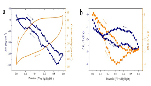 图2 a:在中性电解液中NMO电极质量的变化及相应的CV曲线。b:在碱性电解液中NMO的共振频率变化和共振峰宽变化。